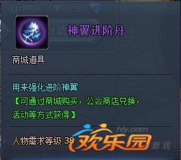 玩家获得神翼后可以通过使用“神翼进阶丹”提升神翼等阶,神翼等阶越高神翼的外观越炫酷、